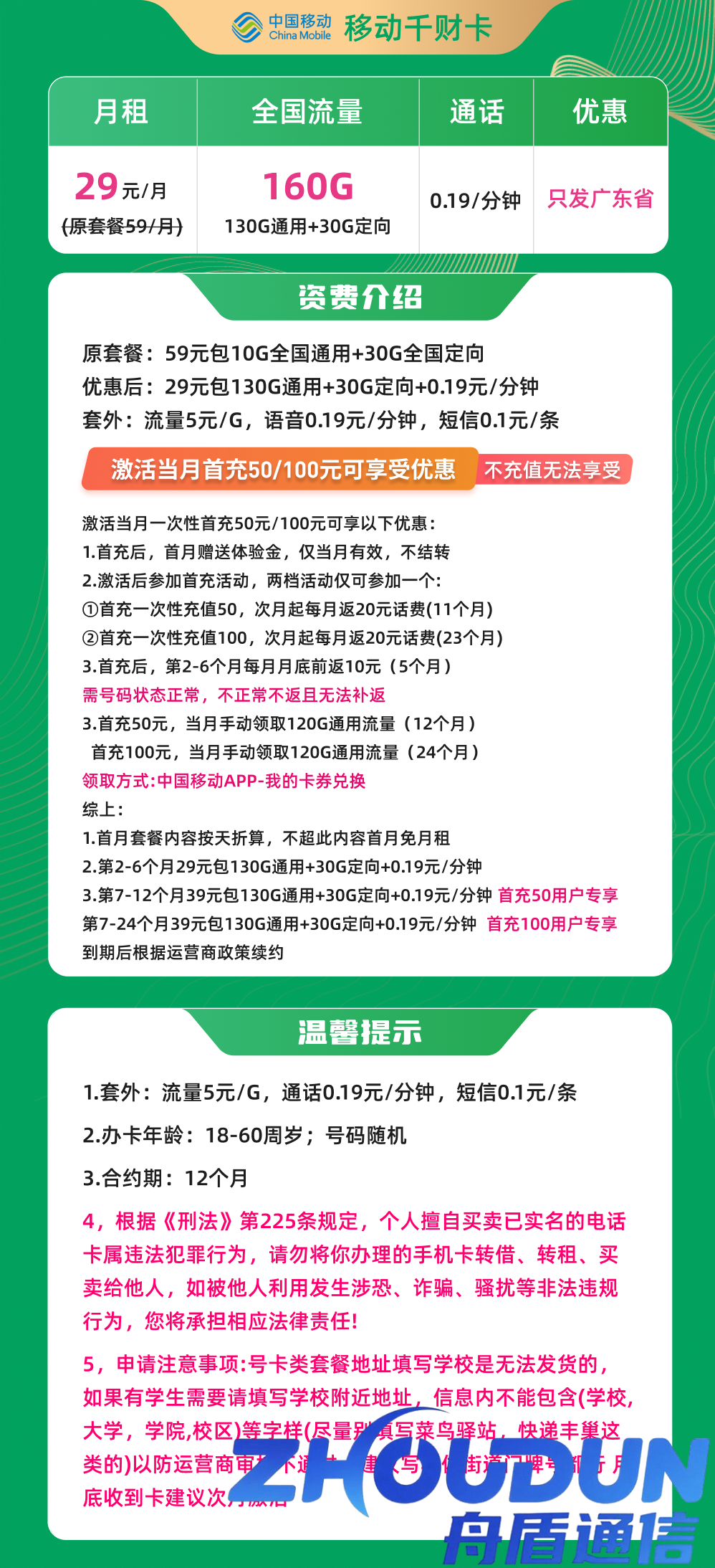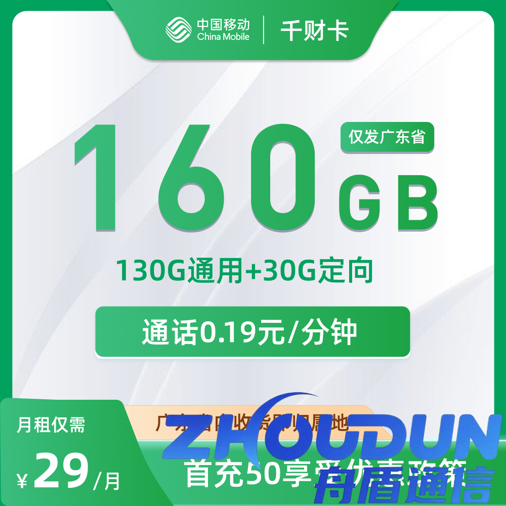 移动千财卡29元包130G通用+30G定向+通话0.19元/分钟
